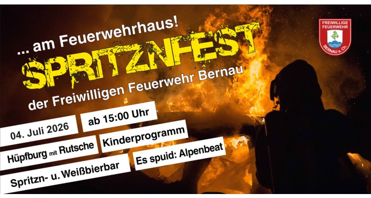 Auch dieses Jahr veranstaltet die Feuerwehr Bernau wieder das Spritznfest und zwar am Samstag, den 4. Juli 2026 am Feuerwehrhaus in Bernau (Chiemgaustraße 10, 83233 Bernau am Chiemsee).Ab 15 Uhr geht es los mit unserem Familiennachmittag und verschiedenen Attraktionen für Groß und Klein - dieses mal mit einer riesigen Hüpfburg mit eigener Rutsche! Für die kulinarische Seite sorgt unser Koch mit Schmankerl wie Grillfleisch und Steckerlfisch, und für die Erfrischung steht unsere Weißbier- und die Spritzn-Bar zur Verfügung und bereitet euch sommerliche Longdrinks und Cocktails zu. Für die richtige Stimmung sorgt dieses Jahr "Alpenbeat" - es ist für jeden was dabei!