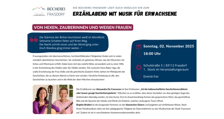 Frauengestalten mit übermenschlichen, furchteinflößenden Fähigkeiten finden sich in vielen mündlich überlieferten Geschichten. Sie verbindet ein geheimes Wissen, das die Menschen mit Scheu und Misstrauen erfüllt. Dabei kann sich das zutiefst Böse verwandeln und zu einer Hilfe in der Entwicklung des Helden oder der Heldin werden. Die russische Hexe Baba Yaga, die uralte Erscheinung der Frau Holle und die griechische Zauberin Kirke stehen im Mittelpunkt der Geschichten, die an diesem Abend zu hören sein werden. Herzliche Einladung an alle, den Geschichten zu lauschen und in die Welt der alten Märchen einzutauchen!
