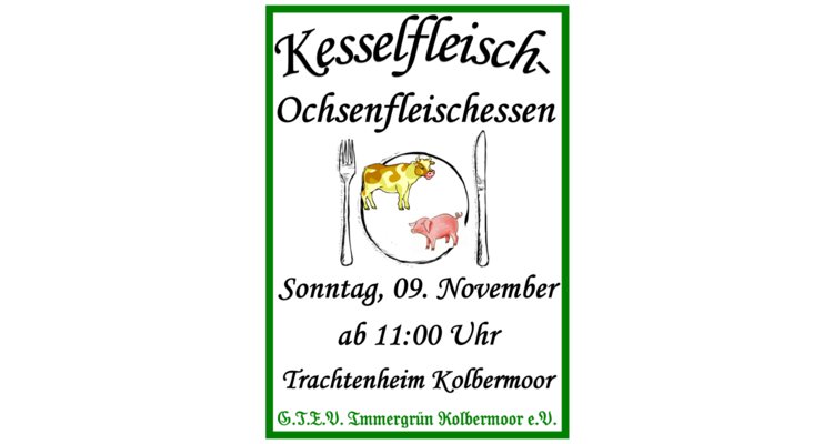 Der Trachtenverein Immergrün Kolbermoor lädt, zum traditionellen Kessel- und Ochsenfleischessen. Bei Kaffee und Kuchen findet der Nachmittag einen gemütlichen Ausklang.Wie immer wird die Veranstaltung musikalisch umrahmt.