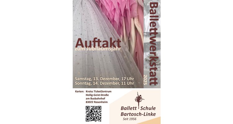Die Ballettschule Bartosch-Linke feiert 2026 ihren 70. Geburtstag in Rosenheim.Zum Start in das Jubiläumsjahr gibt es am 13. und 14. Dezember 2025 einen "Auftakt" im Theatersaal des Künstlerhofs am Rosenheimer Ludwigsplatz.