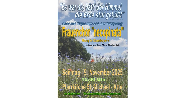 Diese Zeile aus dem berühmten Gedicht "Mondnacht" wurde um 1835 von Joseph von Eichendorff, einem der bedeutendsten Dichter der deutschen Romantik, verfasst. Die Zeile ist mit Inspiration zum Konzert mit dem Frauenchor „necopinata“ aus Haag in Oberbayern. Zum Lob der Schöpfung erklingen Chor und Orgel in der Pfarrkirche St. Michael in Attel. Leitung und an der Orgel Marie-Thérèse Klein.